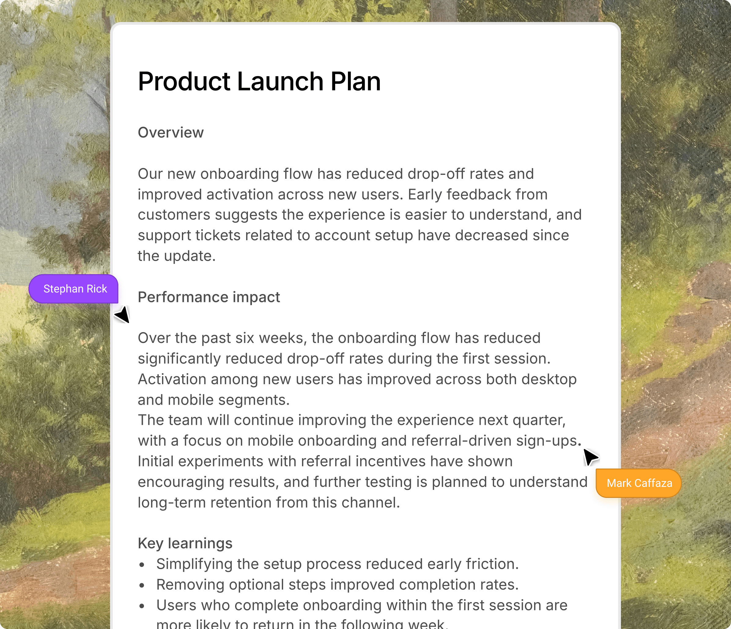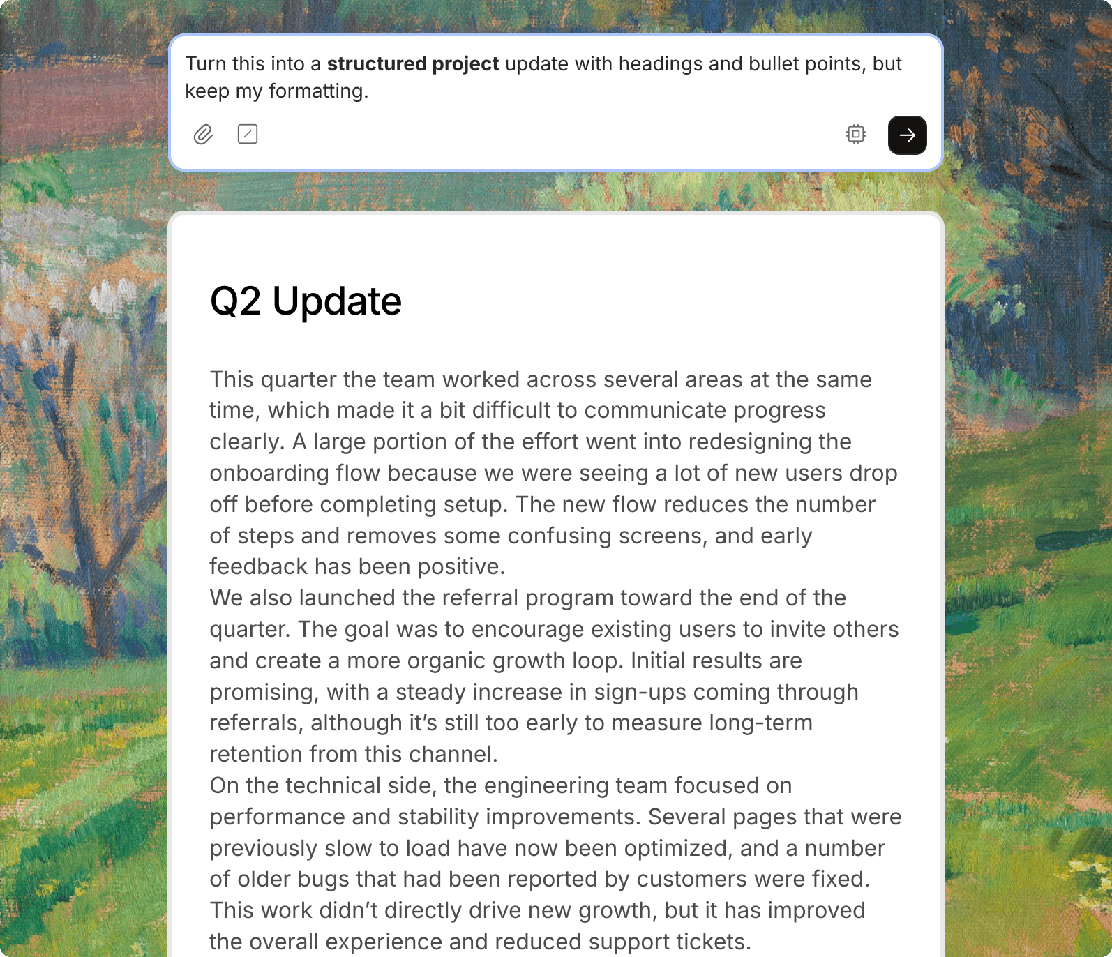 Turn this raw text into a clean, formatted project update